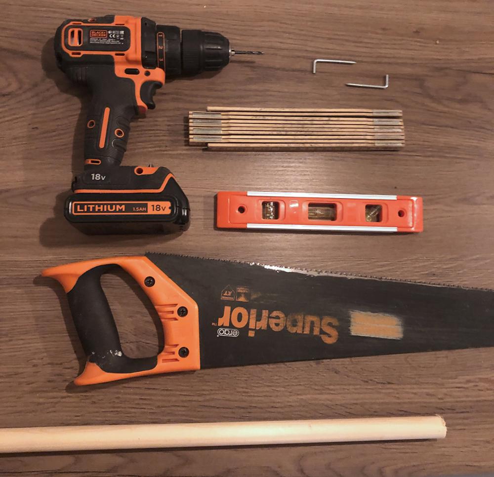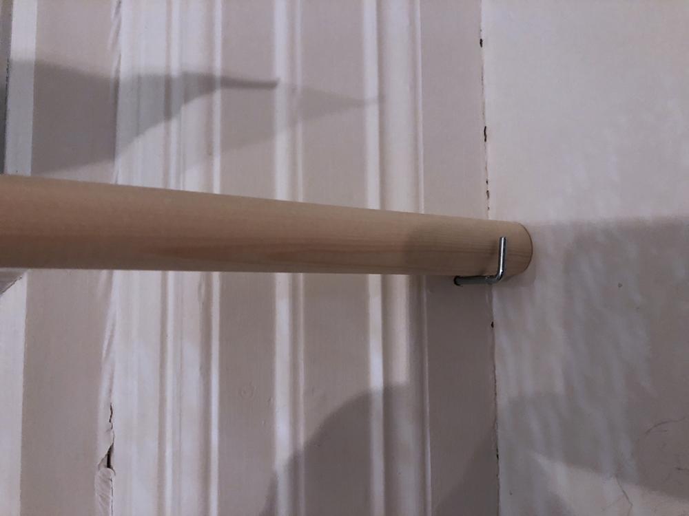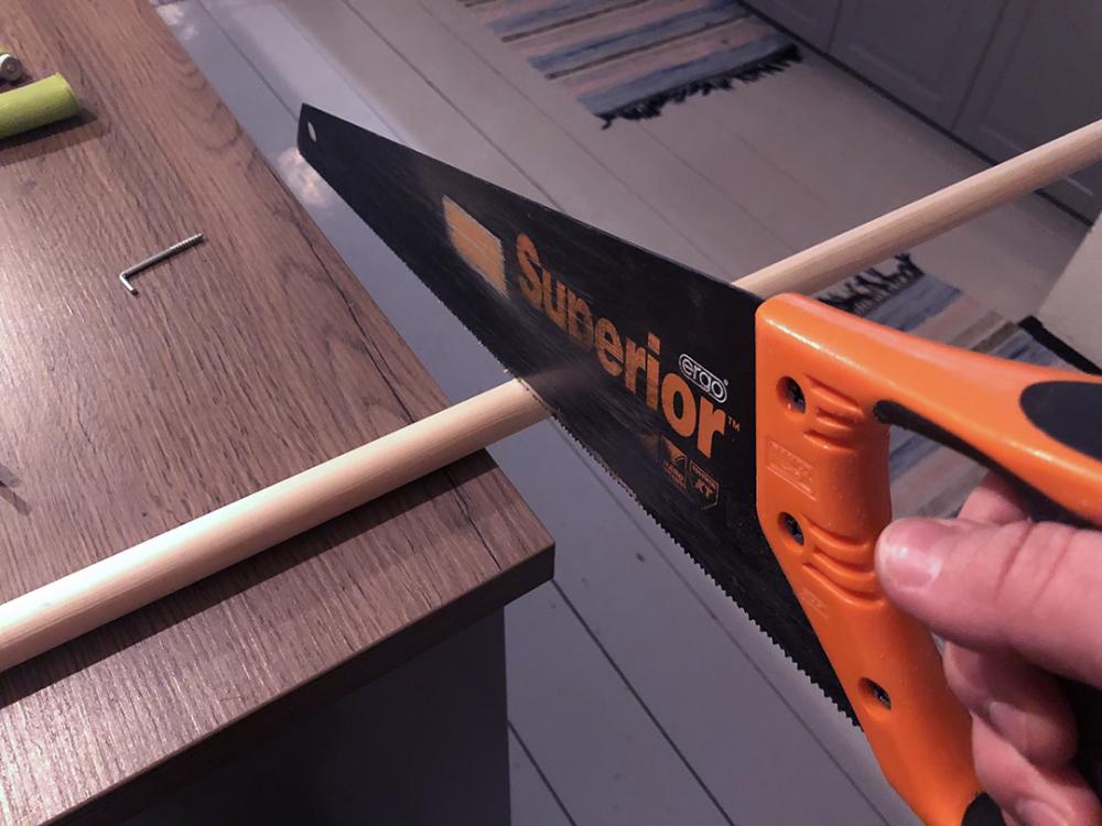 Jag sågar till rundstaven (som finns i flera olika dimensioner) i exakt samma bredd som fönsterfodrens iutsida, men det går såklart lika bra att fästa gardinstången innanför karmen om man vill att den ska gå hålla sig inne i fönstret liksom.