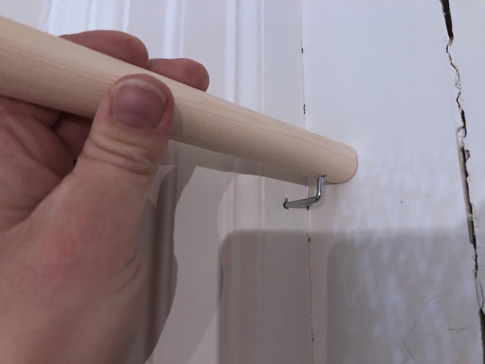 När hålen är borrade och slipade trär jag på stången på krokarna.
