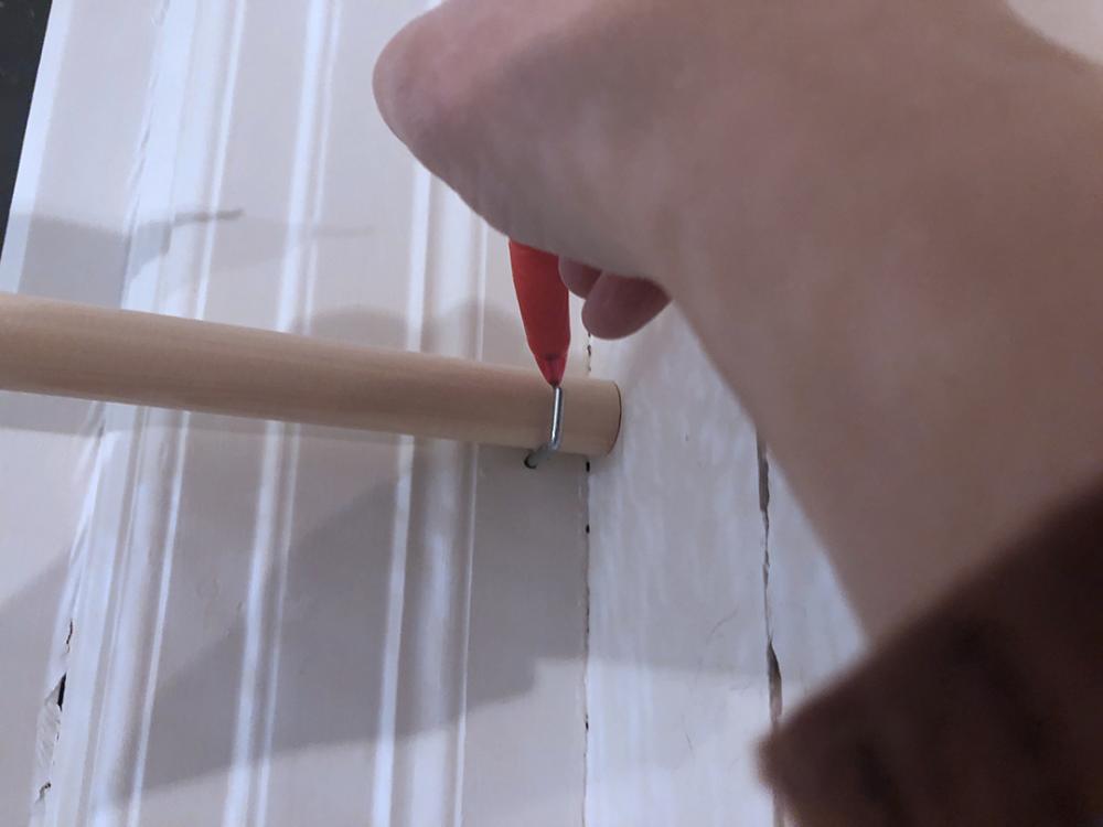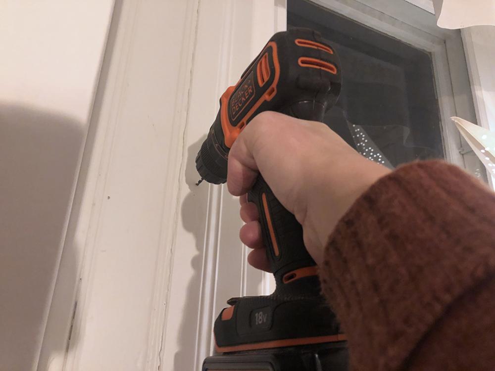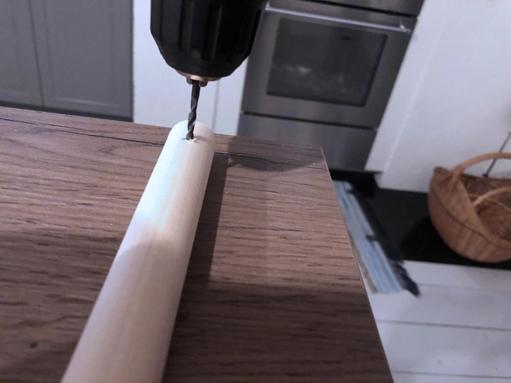 Jag borrar hål för krokarna så att jag kan trä på stången på dem, detta bildar också ett litet mellanrum mellan fönsterfoder och gardinstång, vilket blir himla snyggt.