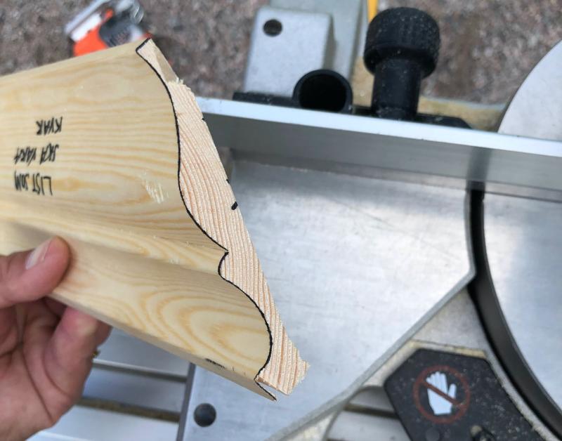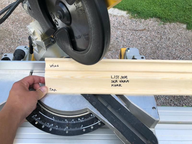 Nu är det dags att såga. För att få till rätt vinkel - och håll nu i hatten för det här är helt bak och fram - så vänder jag listen upp och ner och bak och fram. Den del som skulle sitta neråt vänds alltså uppåt och den del som ska sitta mot taket nedåt i sågen. Listen ska dock vinklas som om den satt mellan tak och vägg för att snittet ska bli rätt.