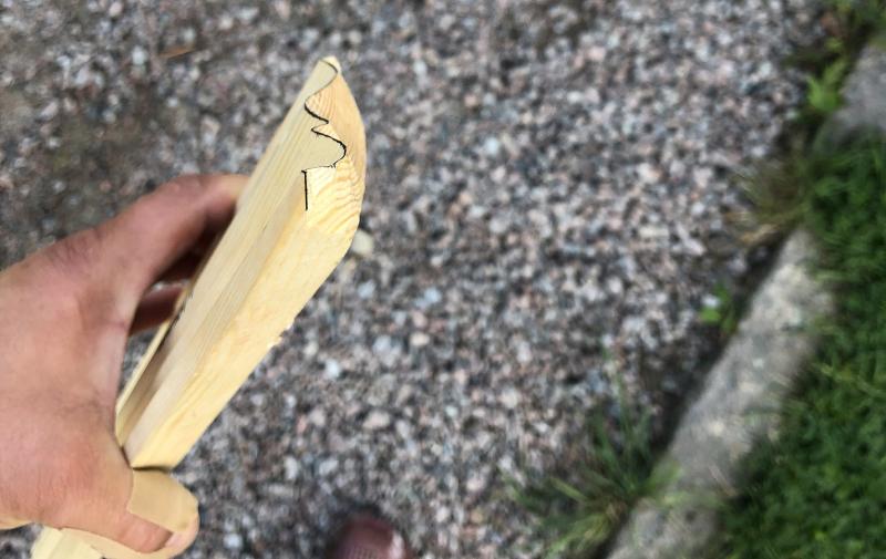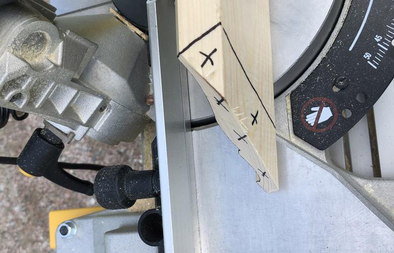 Man sågar sen bort så mycket jag kan med sticksågen, snett bakåt inåt, men utan att förstöra den markerade profilen. Gör sen även ett rakt snitt in från kanterna för att sägerställa att den lilla "flärpen" blir kvar.