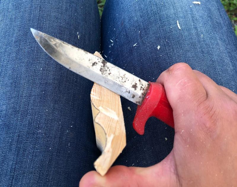 Därefter täljer vi bort alla små delar som jag inte kom åt med sågen. - Var försiktig, det är lätt att slinta! Vissa föredrar kanaske att använda slipmaskin istället för kniv, och det går ju bra det också såklart. Man tar vad man har, men bra verktyg underlättar.
