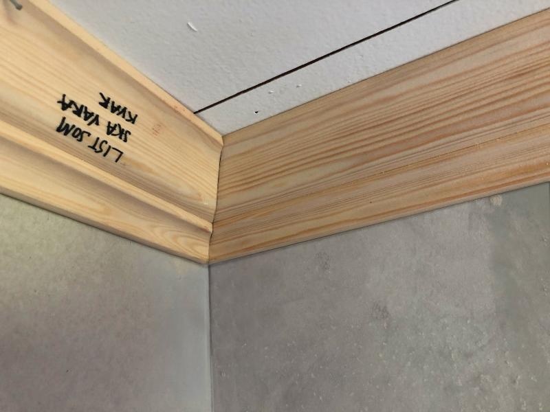 Börja med att fästa den fösta taklisten i rummet med raka hörn som ligger slätt mot väggen. Här ser ni vår Svanhalslist, som även finns i vitt. Men det går hur bra som helst att förkroppa en vanlig hålkälslist eller en list med enklare profil också.
