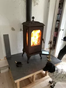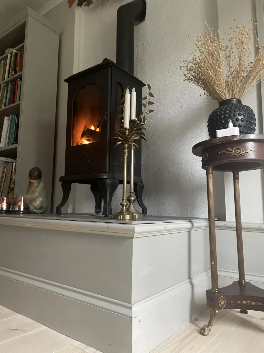 Hemma hos en av våra kunder fanns en charmig, liten gjutjärnskamin som kunden upplevde stod lite för lågt och att brasan inte riktigt kom till sin rätt i det stora vardagsrummet. Lösningen blev att bygga en stomme av reglar som lyfte upp kaminen, vilket gjorde den mer synlig från alla håll i rummet. Den nya platån blev dessutom en praktisk avställningsyta – perfekt för att ställa ljusstakar eller vedkorgar när kaminen inte används.