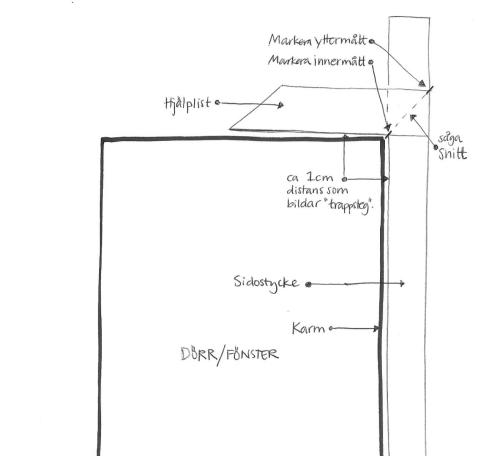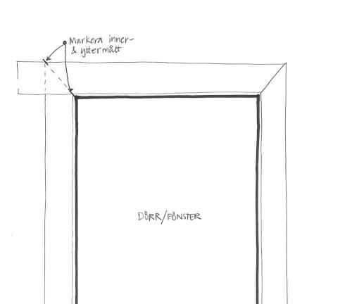 1. Börja med sidorstyckena om du ska sätta foder runt en dörr eller ett fönster. Mät först ut och markera innermåttet - gärna ungefär en centimeter ut från dörr eller fönsterkarmens öppning så att det bildas ett litet trappsteg när du lägger dit listen. Det blir alltid snyggare än att sätta listen exakt kant i kant med salningen. Glöm inte att det ska vara lika runt om så att ditt innermått markeras en cm ovanför karmens överdel också.