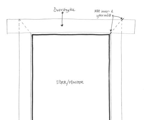 3. Gör klart sidofodren först och mät in överstycket sist. Fäst sidofodren löst och mät sen inner- och yttermått på ena sidan av överstycket. Såga en sida i taget och mät noga och rita på plats så att du får rätt mått och vinkel när den sista delen av överstycket ska sågas. Alla dörrhål har inte räta vinklar så just den sista inpassningen blir extra viktig, speciellt i gamla hus.
