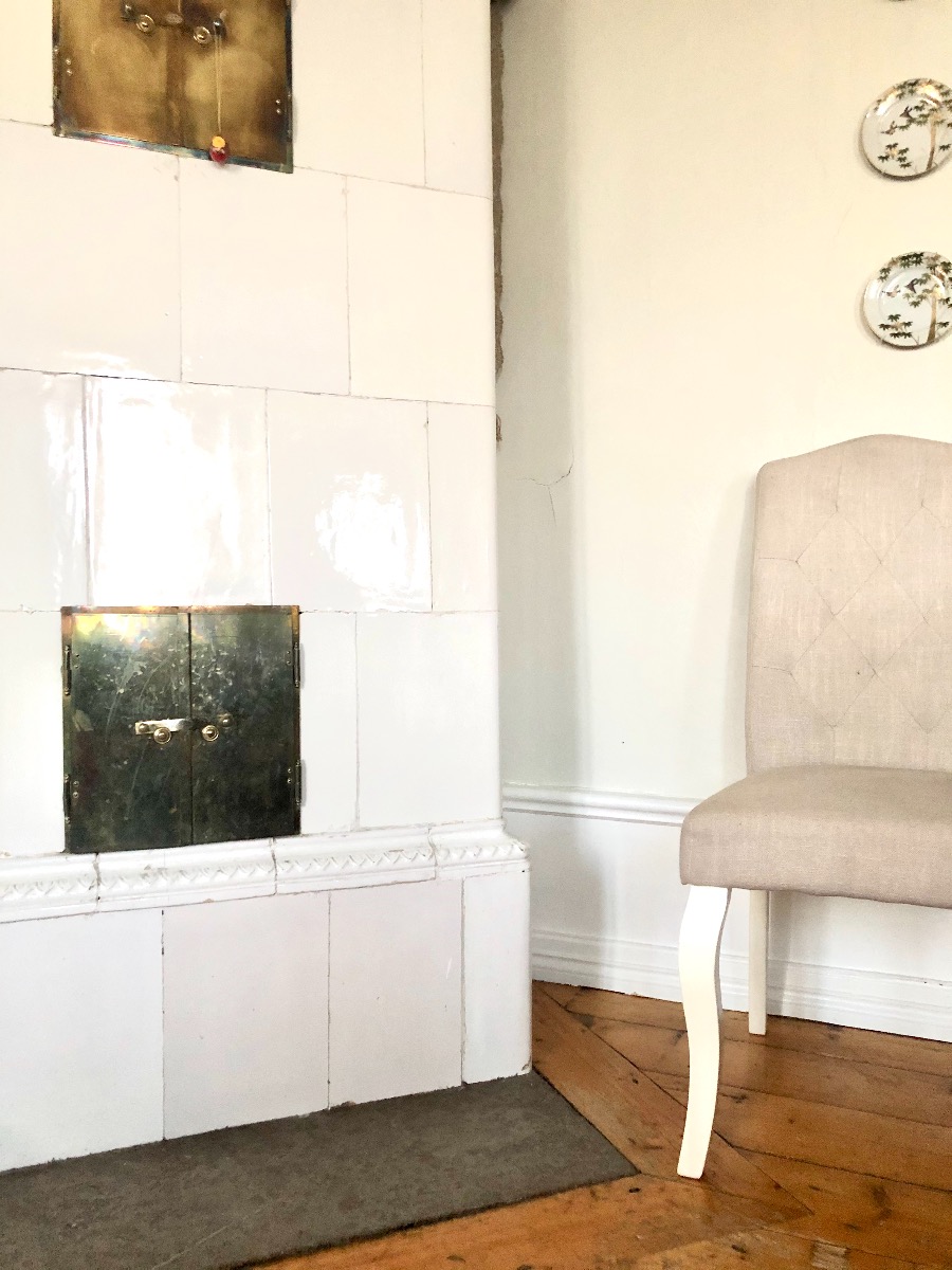 Ofta ser man att höjden på golvsocklar anpassats efter andra linjer i rummet. Det kan vara allt från elementskydd, till – som i det här fallet – kakelugnens fotsims och sockel nertill. Det ger ett enhetligt intryck utan störande skillnader längs väggarna.