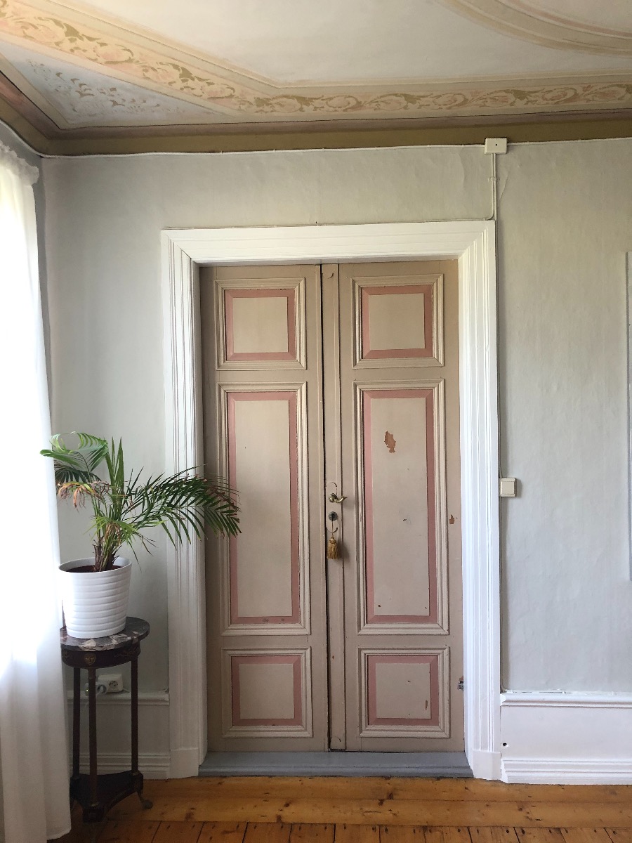 En lite lägre modell av tredelad golvlist. En kombination som är egenkomponerad i ett rum med lite lägre takhöjd, men som tillsammans med det vackert målade trägolvet och vackra pardörrar som är ditsatta i modern tid, upplevs rummet ändå pampigare än ett vanligt sovrum.