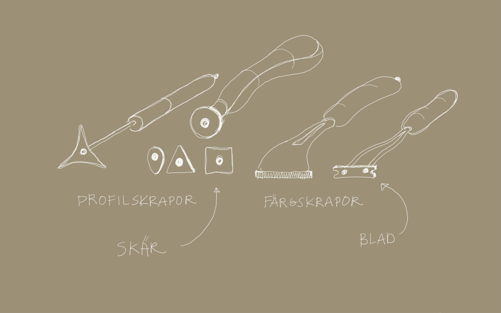 5. Nu är det dags att skrapa. Lös färg tas enkelt bort med skrapa eller stålborste. Om färgen sitter hårt rekommenderar vi en bra värmepistol eller Speedheater. Undvik att bränna träet och använd en skrapa som kommer åt i profilerna. Vi brukar använda en mindre profilskrapa med utbytbara skär så att man kommer åt ordentligt utan att skada profilen och en större platt skrapa för de plana ytorna. Slipa sen med ett fint sandpapper för att släta ut eventuella skav och resta fibrer som blivit av skrapningen.
