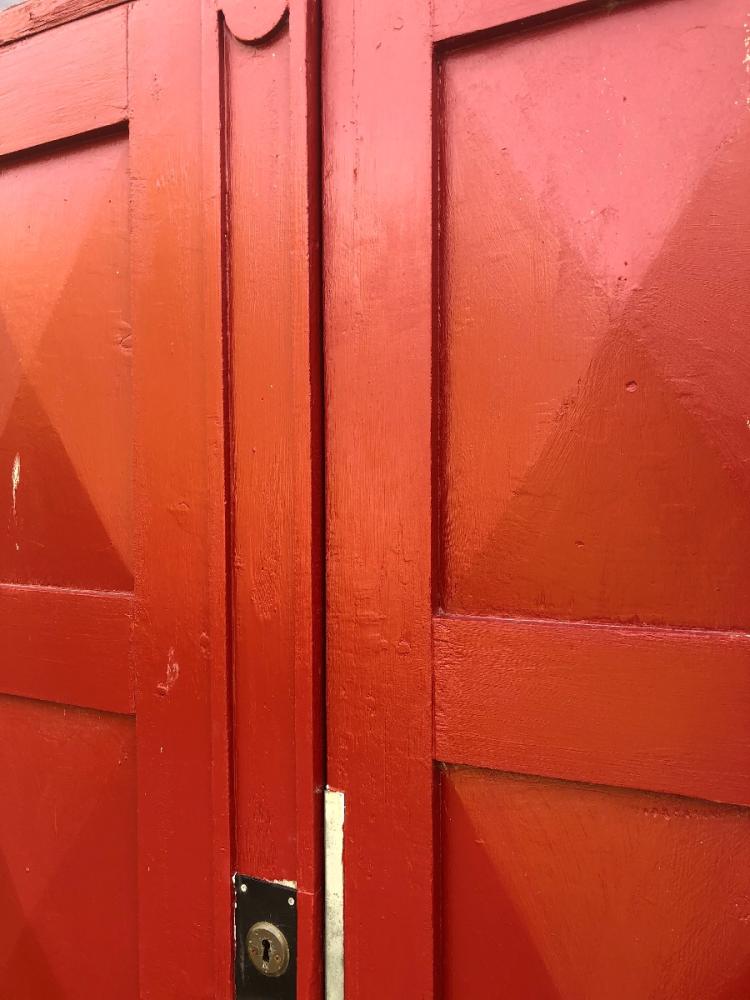 Så småningom ska det båda dörrblad renoveras noga ute och inne, men för att slippa ytterligare en dragig vinter tätar jag nu inifrån på det vänstra dörrbladet genom att sätta upp en list i mötet mellan de två som jag fäster i det vänstra men låter gå ut till ungefär hälften utanför.