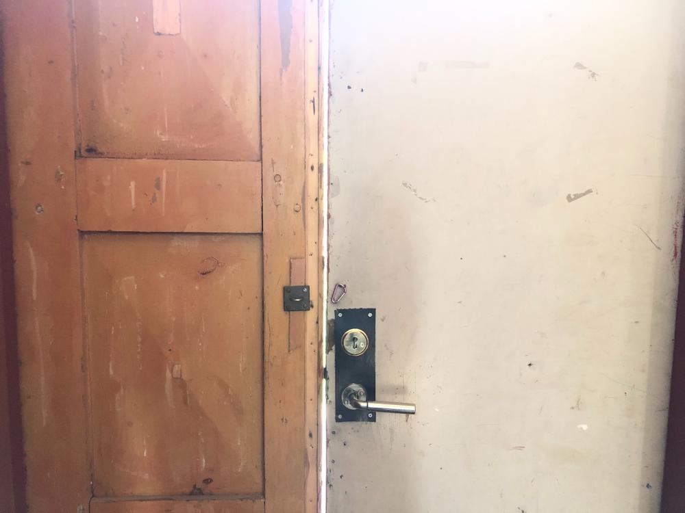 Dörrar i stort behov av renovering...Här drar det rakt in i groventré och kök när inte innerdörren är stängd.