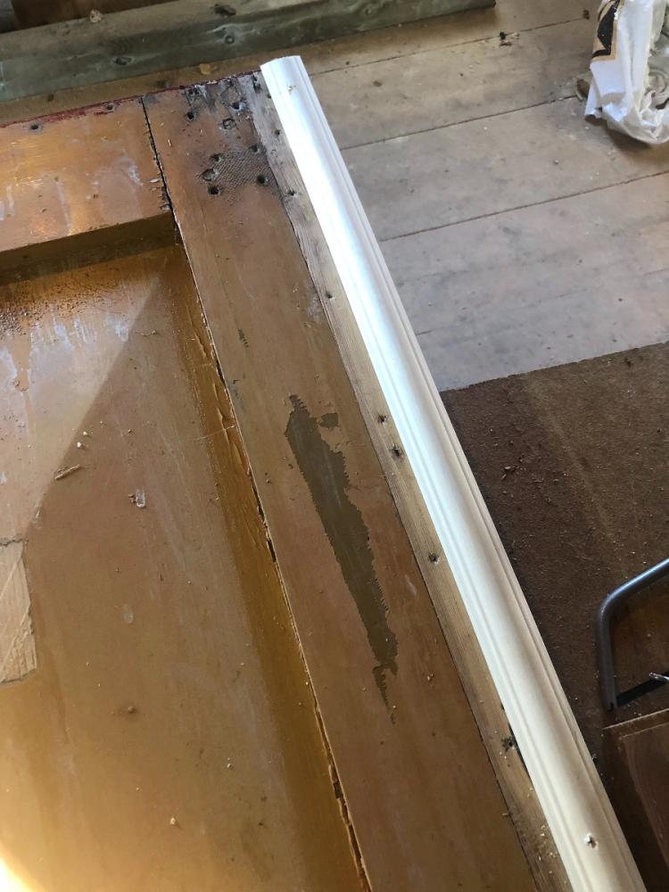 För att listen inte ska vara i vägen upptill och nertill, när man stänger dörren, så sågar jag av den snett ner mot avslut så att det blir en liten fas längst ut i båda ändar. Jag sätter även en remsa med tätningslist av lin på den nya dörrlisten som jag häftar fast.