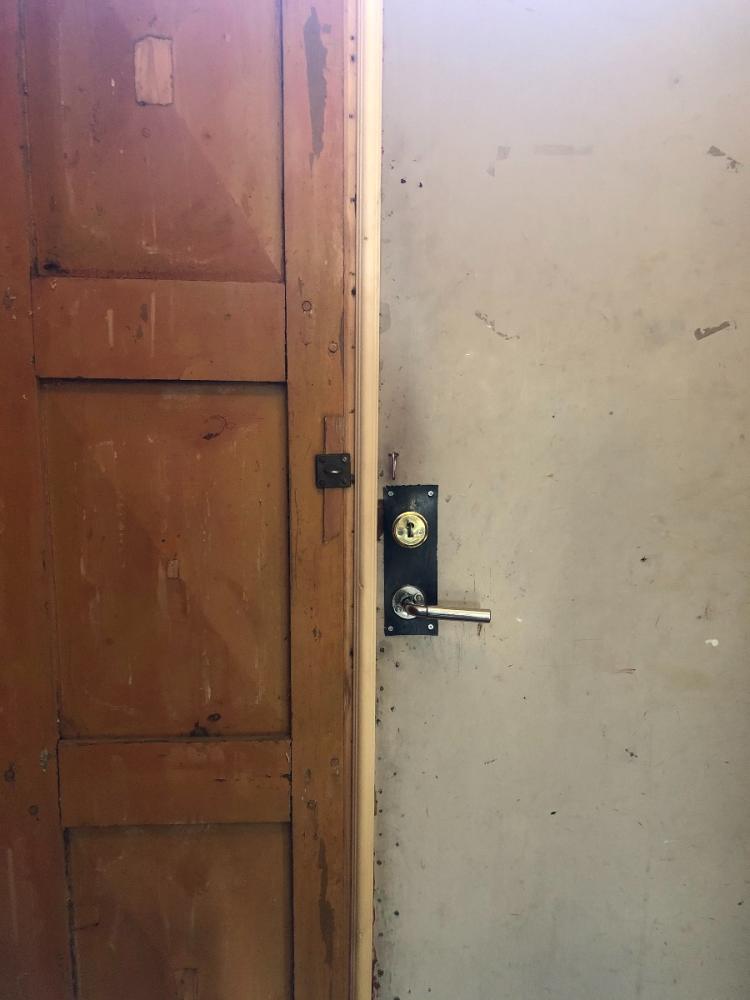 Nu återstår bara att spackla, slipa och måla den slitna ytan med lite linoljefärg, och ta bort masoniten på det högra dörrbladet. Men eftersom linoljefärg behöver några plusgrader för att torka får detta vänta till våren. Nu har vi i allafall en tät dörr och är redo inför vintern.