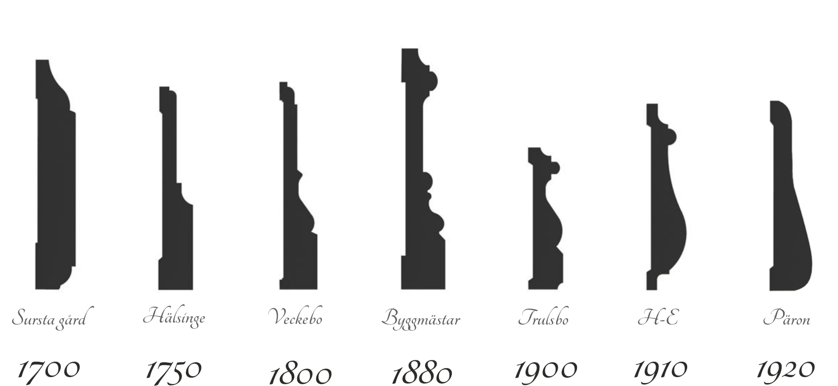 Vi har delat upp våra kategorier i shopen så att du kan söka bland annat på den stilepok du är ute efter. Har du tillexempel ett sekelskifteshus vill du säkert titta på sortimentet med förlagor från 1880-1920-talet. Nedan kan du läsa mer om tidstypiska snickeridetaljer på taklister, dörrfoder, fönsterfoder, golvsocklar, fodersocklar och dekorlister.