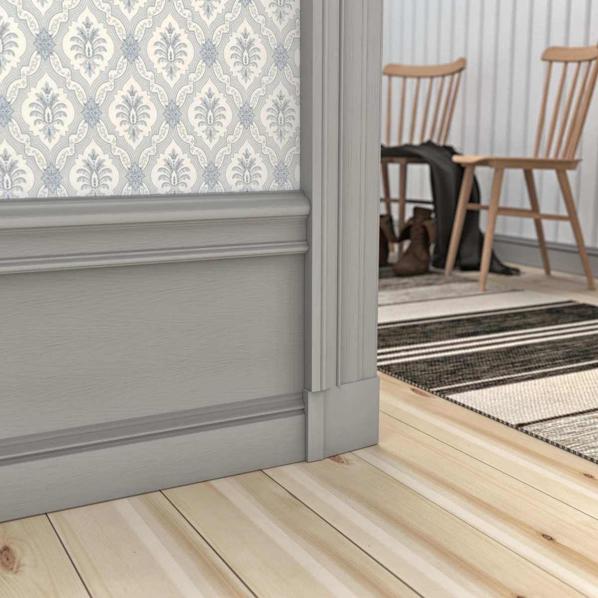 Bröstlisten utgör översta delen av Tredelad sockel Fogelberg. Övriga delar är Planhyvlad mellanbräda samt Golvsockel Fogelberg.